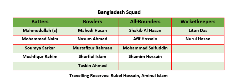 Bangladesh headline Group B, arguably the weaker of the two groups, and have finalised their 15-man squad for the tournament. After landmark series wins over Australia and New Zealand earlier this year the squad has remained near-identical for the World Cup. The team will be led by Mahmudullah, who has captained the side in their recent series wins, as well as in wins over India, Sri Lanka and Zimbabwe over the last three years.