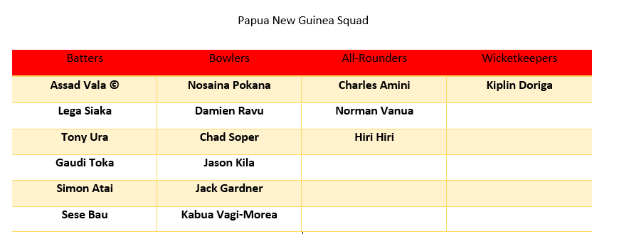 Who they’ve picked: The Barramundis have selected a 16-man squad for the tournament, featuring many players who were pivotal in their qualification for the tournament. Batsman Assad Vala will captain the team, with fellow experienced batsmen in Tony Ura, Lega Siaka and Charles Amini. They are accompanied in the bowling department by incumbents Norman Vanua, Chad Soper and Nosaina Pokana, as well as new faces Jack Gardner and Kabua Vagi-Morea have earned maiden call-ups to bolster the bowling ranks of the team. Hiri Hiri and Jason Kila are expected to do the majority of the spin bowling, with Vala (off-spinner) and Amini (leg-spinner) also able to contribute handy overs of spin. Kiplin Doriga remains the incumbent wicket-keeper, while batsmen Simon Atai, Sese Bau and Gaudi Toka will fight it out for depth spots in the eventual 15-man squad for the tournament.