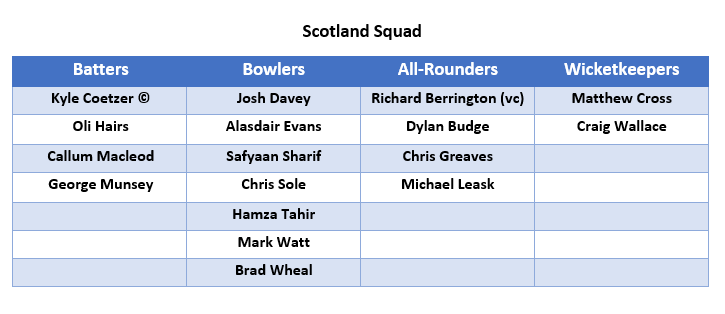 Scotland have named a strong 17-man squad boosted by inclusions from the County circuit for the World Cup. Their fast bowling battery will be their strength over the teams in this group, and could give them an edge should they qualify for the Super 12s, where they would have another chance at a big upset like their win over England in 2018. They will be skippered by Kyle Coetzer, and he has led them well so far against Zimbabwe, with his team losing narrowly in the decider of the three match series.
