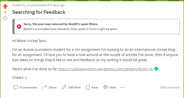 Reddit has been the life-blood of my Digital Artefact so far, and was a #fist change in my process as I learned how to best use it on the go by testing and prototyping to discover the most effective user involvement strategies. Before I was only on Twitter, but I was forced to break that loop and access a program that would assist me in achieving my social utility of opinion based content by a young cricket journalist.