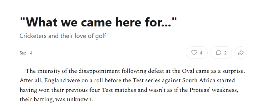 This epiphany may seem obvious, but interactions with players online for journalists like Neil and Jarrod can be huge in them receiving negative or positive receivership of a piece. I thought about this more deeply after reading this article from LaTrobe University, which discusses, amongst anything, the change in the physical relationship between a journalist and a player. In the article Narelle Harris notes that media teams within sports organisations often indicate who will speak to the press, and during the height of the COVID-19 pandemic this became even more stringent. The reason this has arisen is that Neil recently wrote a piece arguing that the South African team should have played more practice matches between Tests instead of playing golf, and when now-retired South African cricket legend Dale Steyn chimed in the posts viewership skyrocketed. It is not uncommon for ex-cricketers to throw their two cents in the ring, but to have a recently retired and very successful player who had played with many in the current team throw his opinion in saw the whole post become elevated on another level.