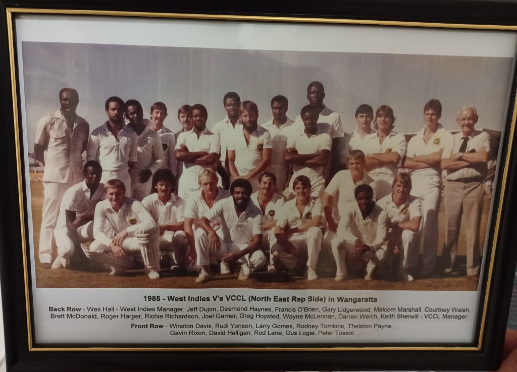 The West Indies batted first, with Haynes the first man out to captain and Wangaratta fast bowler Gary Lidgerwood, who also took the wicket of Thelston Payne to leave them 2-10 early on. With plenty of grass left on the wicket there was movement on offer for the opening bowlers, and while Greg, who was just 23 at the time, was aware that Davis, Walsh, Garner and Marshall would get to return serve later on, he was pleased with the team’s start. Richie Richardson and Gus Logie came out with a goal of entertaining the capacity crowd of 10,000 that had gathered, with Greg recalling a six that Richardson hit just before his dismissal.