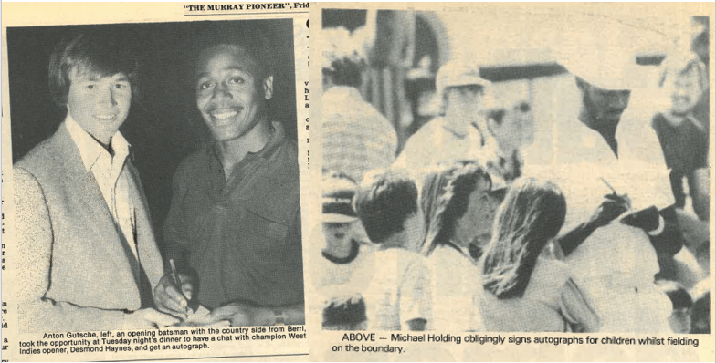 21 year-old Anton Gutsche opened the batting for the locals, and while he only made four he weathered the early storm of Holding and Davis before he was trapped LBW by Eldine Baptiste. He told The Murray Pioneer “they let a few go that I can’t remember much about. There were a couple of balls I tried to cut and the ball was in the wicket-keepers gloves before my back foot was in position!”