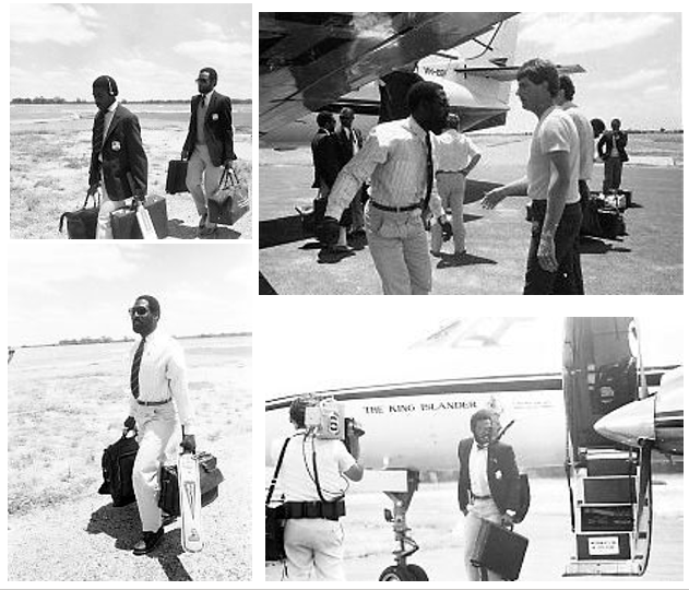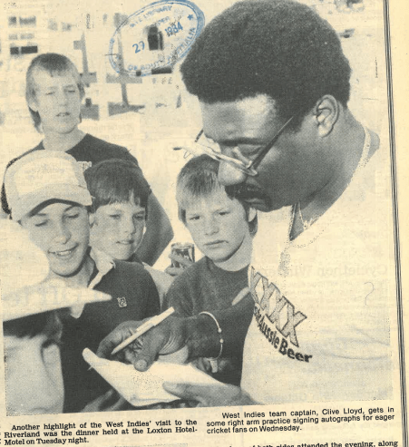 Over 400 people welcomed the West Indies when they flew into Echuca, and around 5,500 attended the match, which was highlighted by the skill and sense of humour of the tourists. The West Indies batted first, with Haynes, Dujon and Richardson getting them off to a decent start, but it was Viv Richards who gave the crowd something to best remember, hitting two towering sixes, both straight down the ground and into the neighbouring tennis courts. It was written afterwards that after one of these sixes Viv turned to his partner and remarked, “[just a] nine iron onto the green.” Number eight Eldine Baptiste then smoked 75 to get their score to 279 from 50 overs. In reply Deniliquin batter Steve Bray made an unbeaten 96 as the country team gave the chase a good shot, reaching 4/215 at the end of their allotted overs.