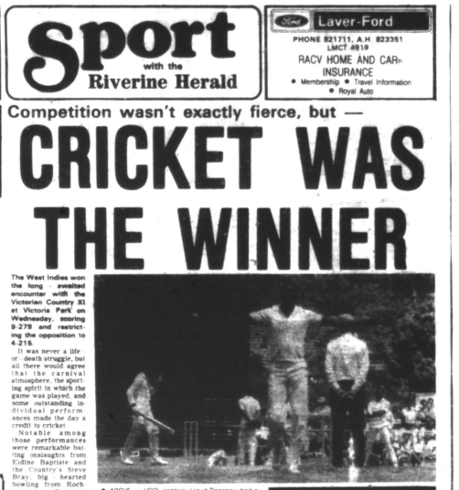 The Riverine Herald‘s cadet reporter Paul Jacobs was 12th man for the match, and he wrote at the time that “my experiences with the West Indies players were like one big dream” and that “the enjoyment and joy I received out of meeting such sporting luminaries will remain with me forever.”