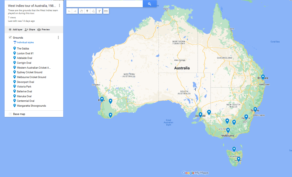 On the 1984/85 tour, there were 141 days between the West Indies first and last match, with 73 days of cricket scheduled in this period across 35 matches in 13 different cities and towns, as shown on this map. That is an astounding amount of cricket, and travel, especially when you consider the workload placed on particularly their fast bowlers.
