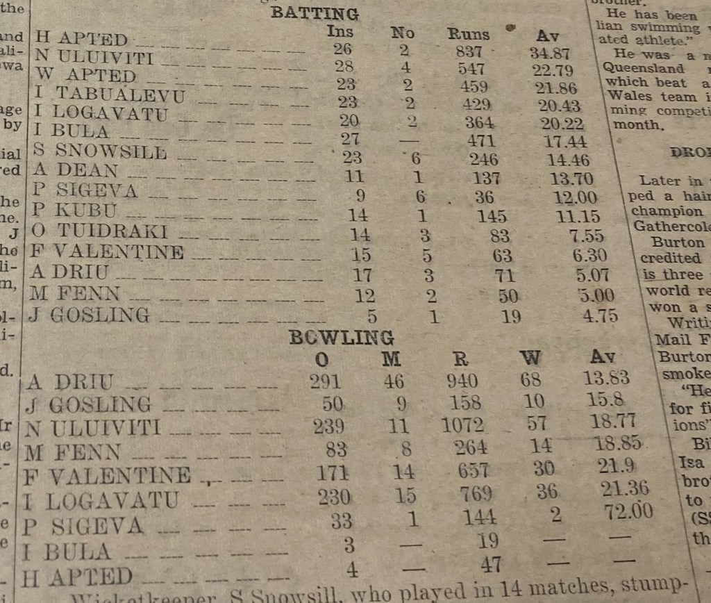 Nacanieli “Nat” Uluiviti (Captain), 27, civil servant, Jack Gosling (Player-Manager), assistant shipping manager, 39, Sid Snowsill (Vice-Captain), CSR officer, 28, Harry Apted, 34, civil servant, Bill Apted, 29, clerk, Ilikena Bula, 38, civil servant, Ayub Dean, 32, school teacher, Asaeli Driu, 29, planter, Maurice Fenn, 48, civil servant, Petero Kubunavanua, 36, customs clerk, Isoa Logavatu, 35, planter, Paula Sigeva, 21, civil servant, Inoke Tabualevu, 23, school teacher, Osea Tuidraki, 25, medical student, Freddy Valentine, 19, optometrist assistant