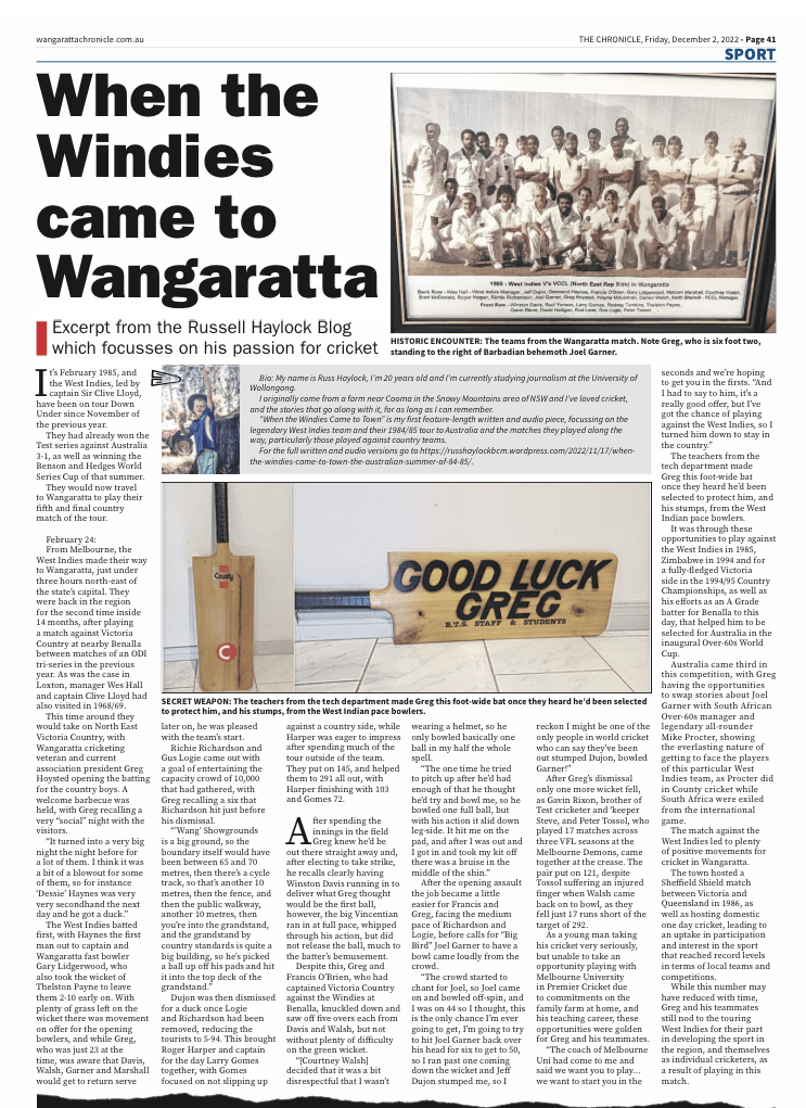An excerpt of my first feature When the Windies Came to Town appeared in the Wangaratta Chronicle, and is linked below.